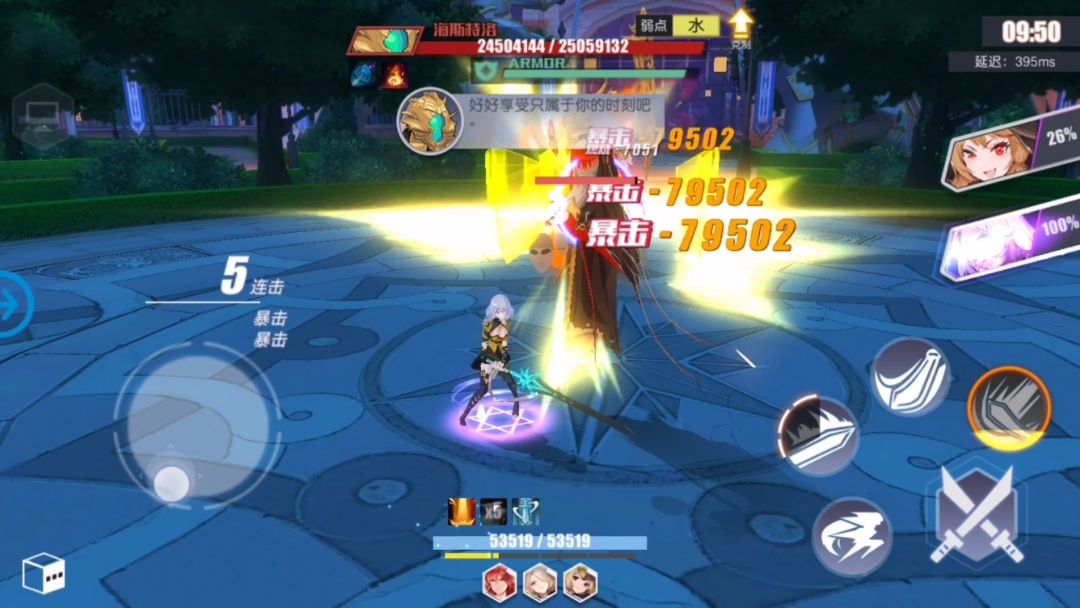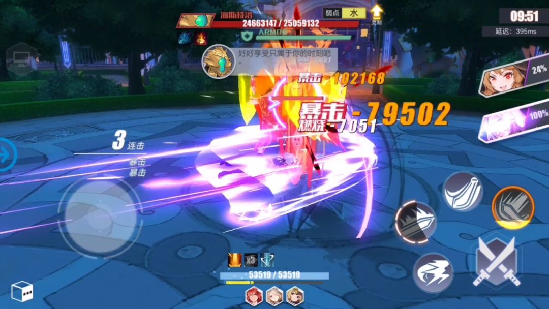 触发燃烧后,第一击普攻53561,1技能102168+79502*3=340674。