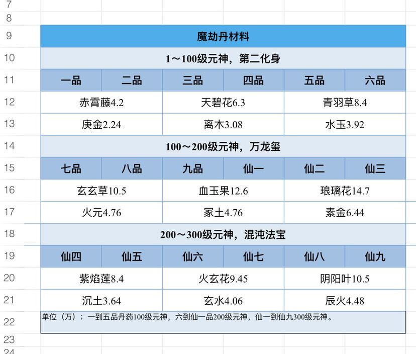 魔劫丹、天地元丹,材料统计