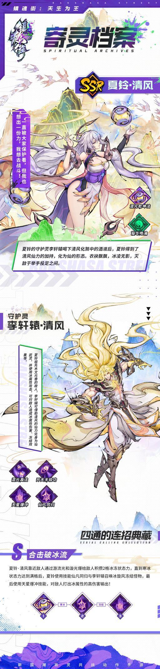 在之前的【寄灵档案】中,四通给各位Bro介绍过镇魂街的头号女主夏铃在游戏中的形象和技能,而熟悉原作的大家肯定也了解,夏铃的守护灵李轩辕更是实力难以估计,且因持有清风化煞而能在人、仙、魔三态中切换!在原著中,我们也见证夏铃一路上的改变与成长,本期将为大家带来全新角色—— 夏铃·清风, 以及仙武灵形态的守护灵李轩辕·清风!