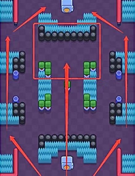 ② 阵容的打法:同样的中路巴利可以稍微靠左路公牛一边,右路的达里尔只需要稍微攻击几下再加上超级技能的自动充能,很快的就能完成超级技能的充能。达里尔拥有超级技能充能后即可直接从右路对敌方保险柜进行一个冲刺。左路和中路没得说,该阵容主要看右路。当左中做出优势时,达里尔可向前压进,不以击杀对线英雄为目的,主要是快速的将超级技能充能冲进敌方保险柜位置。当左中未取得优势时,达里尔这个英雄也能很好的就行防守。防守完成后超级技能基本也差不多了 ,然后冲就完事了。该阵容是稍微偏进攻的阵容,前期我畏畏缩缩,后期我翻滚装弹。