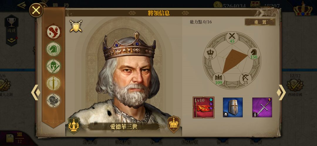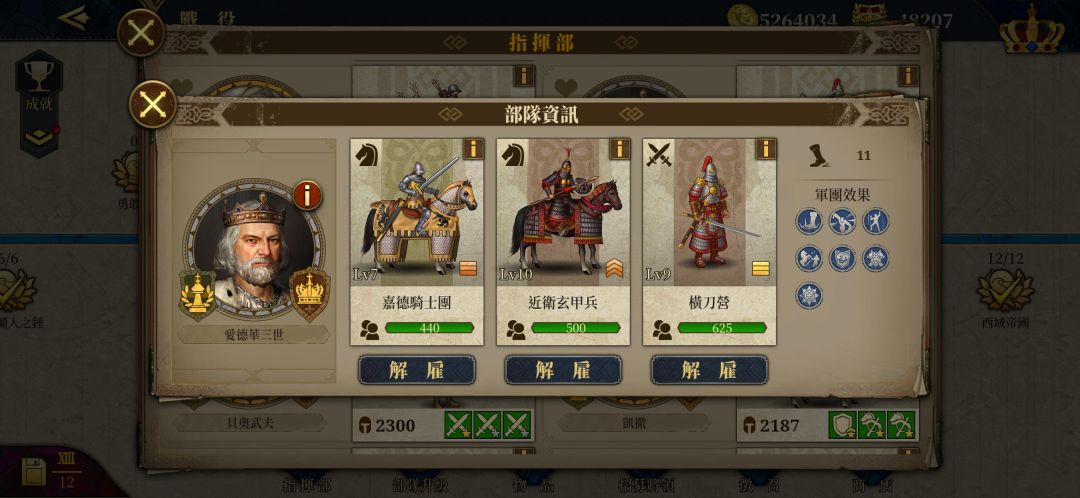 这套配兵和装备偏强度,专武宝石近骑专家(全四级可以变成2级技能),装备蓝桶盔(爱三因为初始强行军只有2级,需要专7加桶盔才能满级强行军),先锋大剑(+10骑兵+10步兵+1剑术大师)。先锋大剑带2级爵位宝石,这样可以爵位升皇帝。