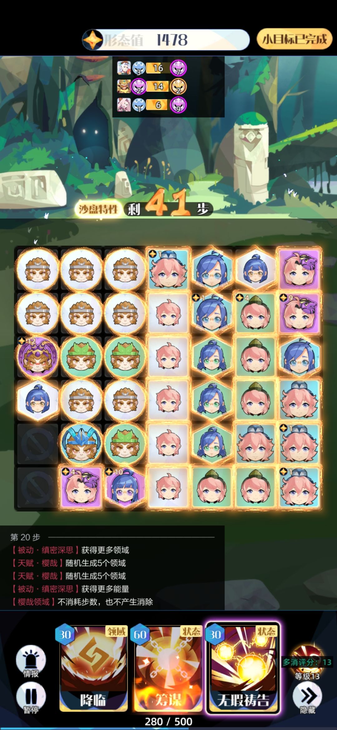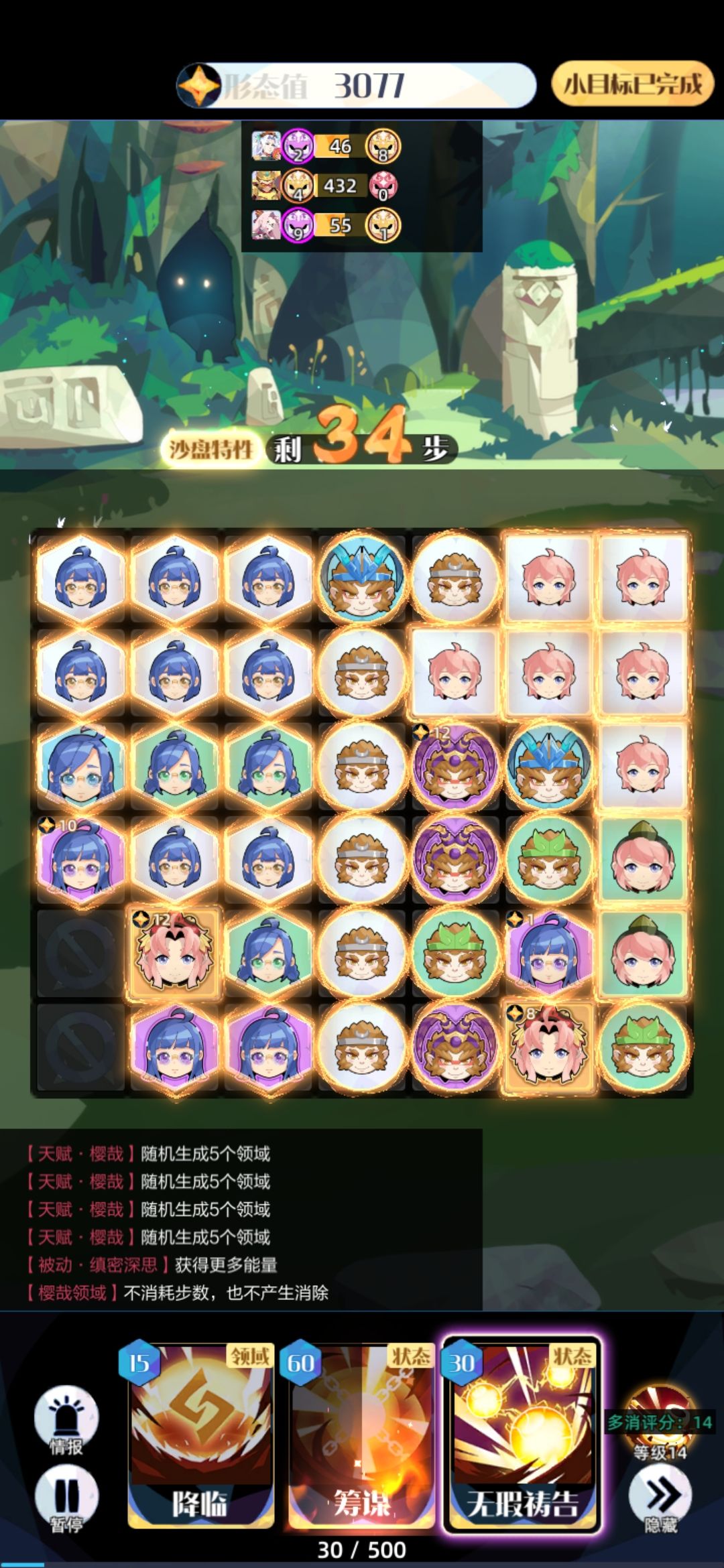 接着就是以前的思路了,找到双多消,摆好位置,被动交换出主力蓝回能量,最后用双多消产领域开始摆盘。主力够四紫时停止筹谋摆盘,祷告升14(还是因为筹谋时不能摆盘)(有个idea是假设这里够五紫,直接五紫升烟斗14,不用浪费能量祷告,各位樱哉玩家可以试试)