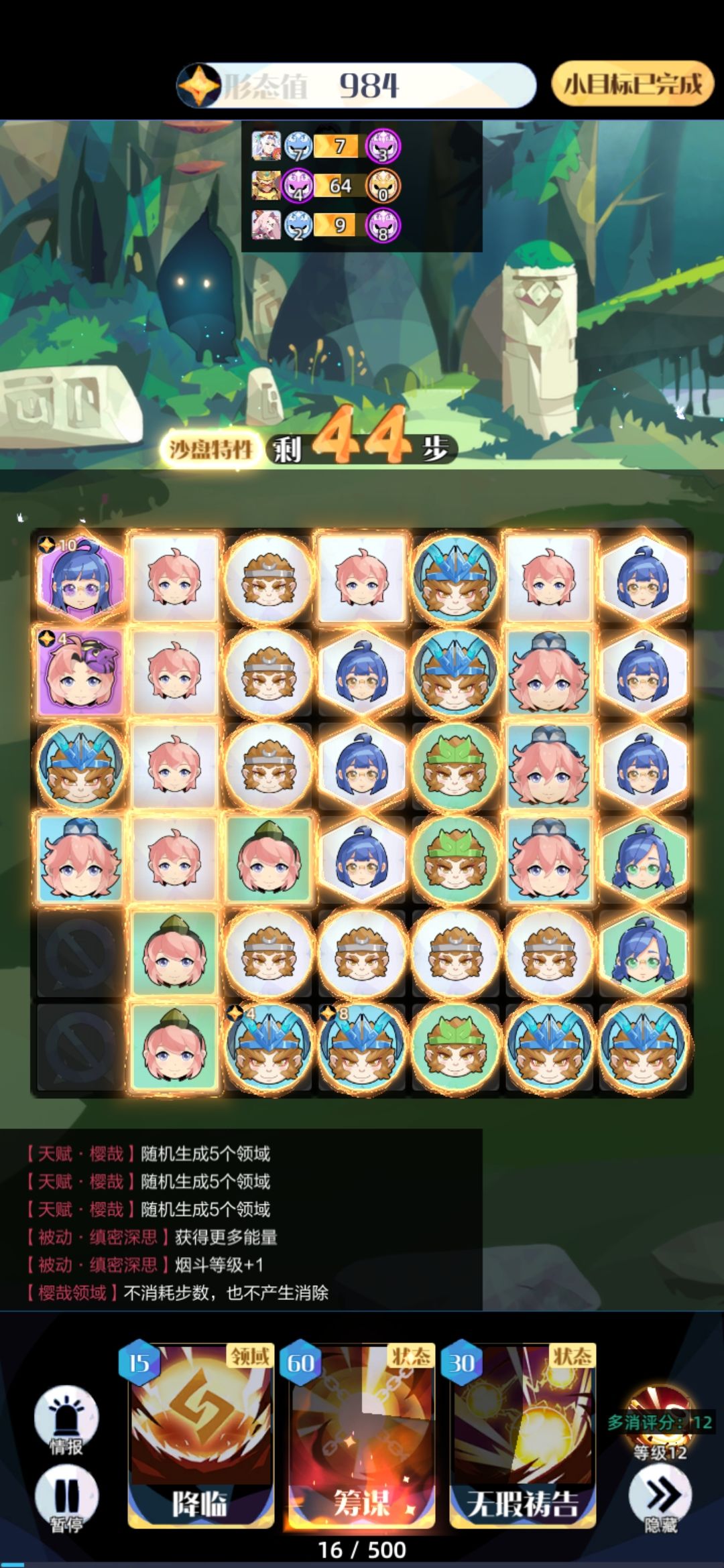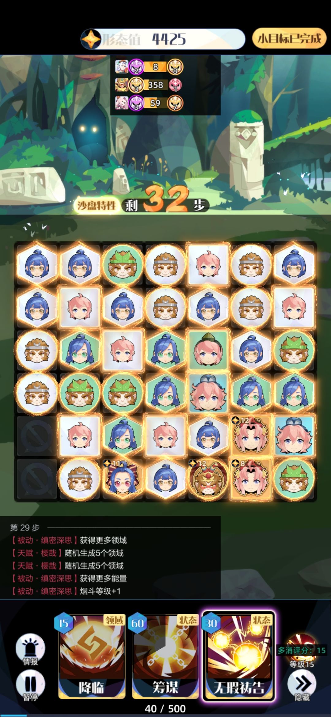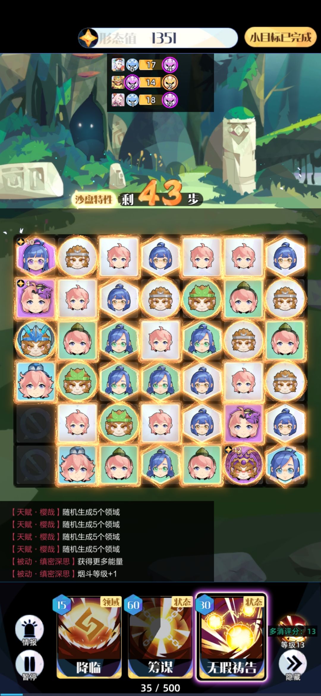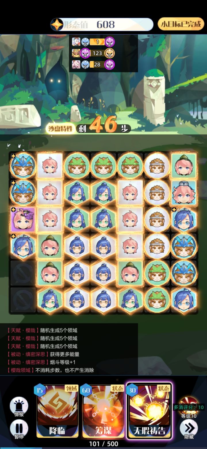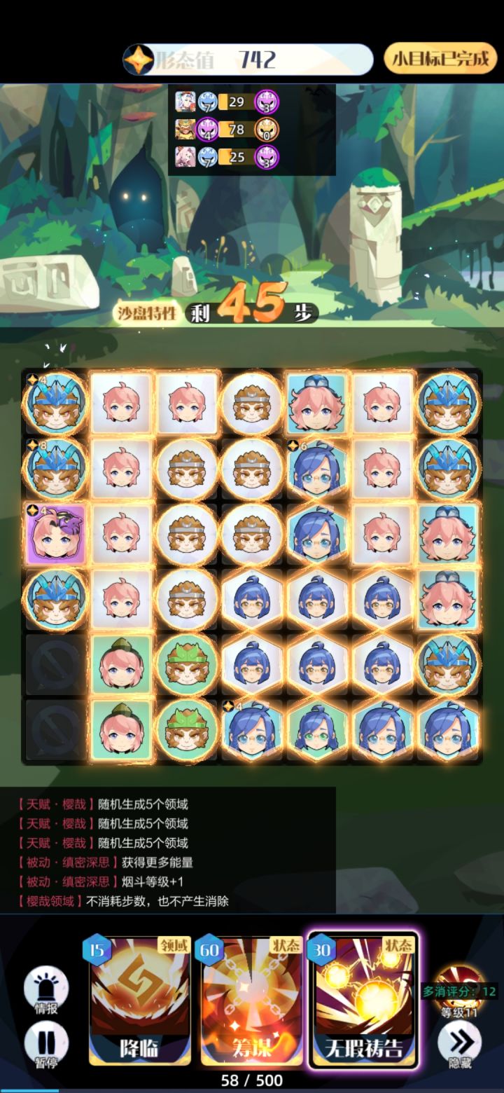 接下来连着三次筹谋摆盘。此时能量大约够三次筹谋。注意筹谋时祷告会失效,所以升9要用6绿,升10要用7绿,升11要用5蓝。