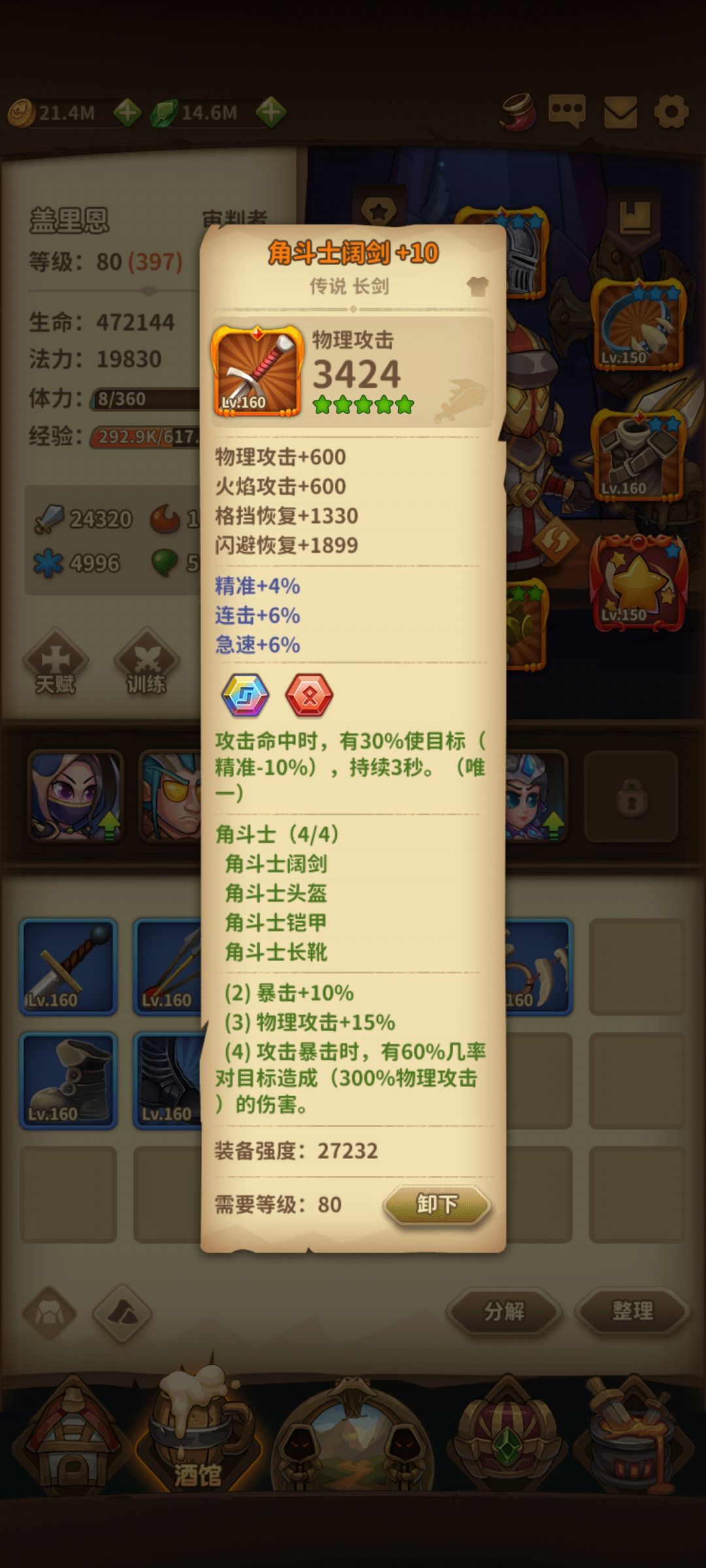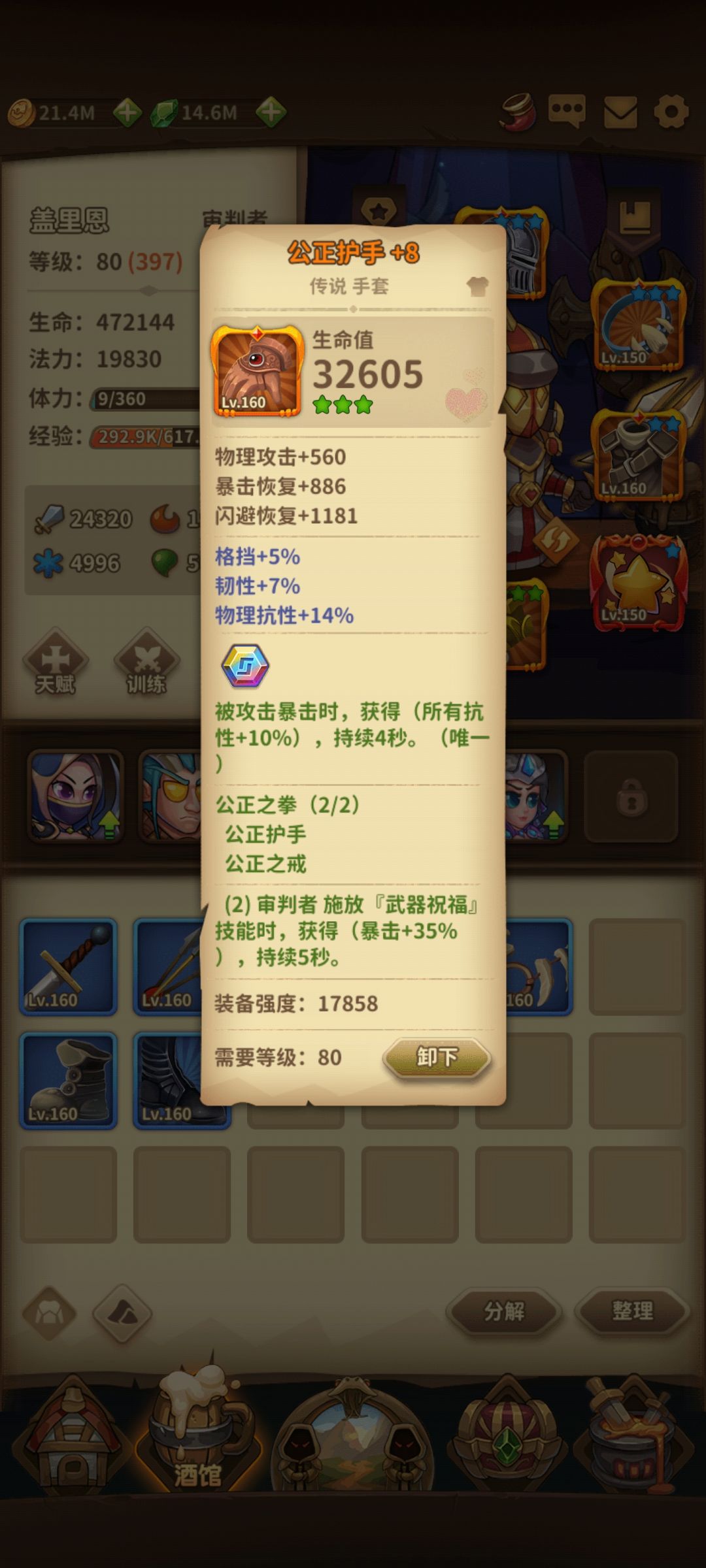 于是疯狂开箱,看到套装属性之后发现用套装可以混合搭配,推塔轻轻松松,100多物抗的怪照样用审判者打,信心力量一套选一个(戒指项链,专精选一个)公正一套选一个(护手戒指,专精选一个加角斗士一套共6件,后两件我用的是金属网格和星之雨,强化最多+15,基本都是+10,不多说直接上图中期审判者推塔流准备推荐,主套装