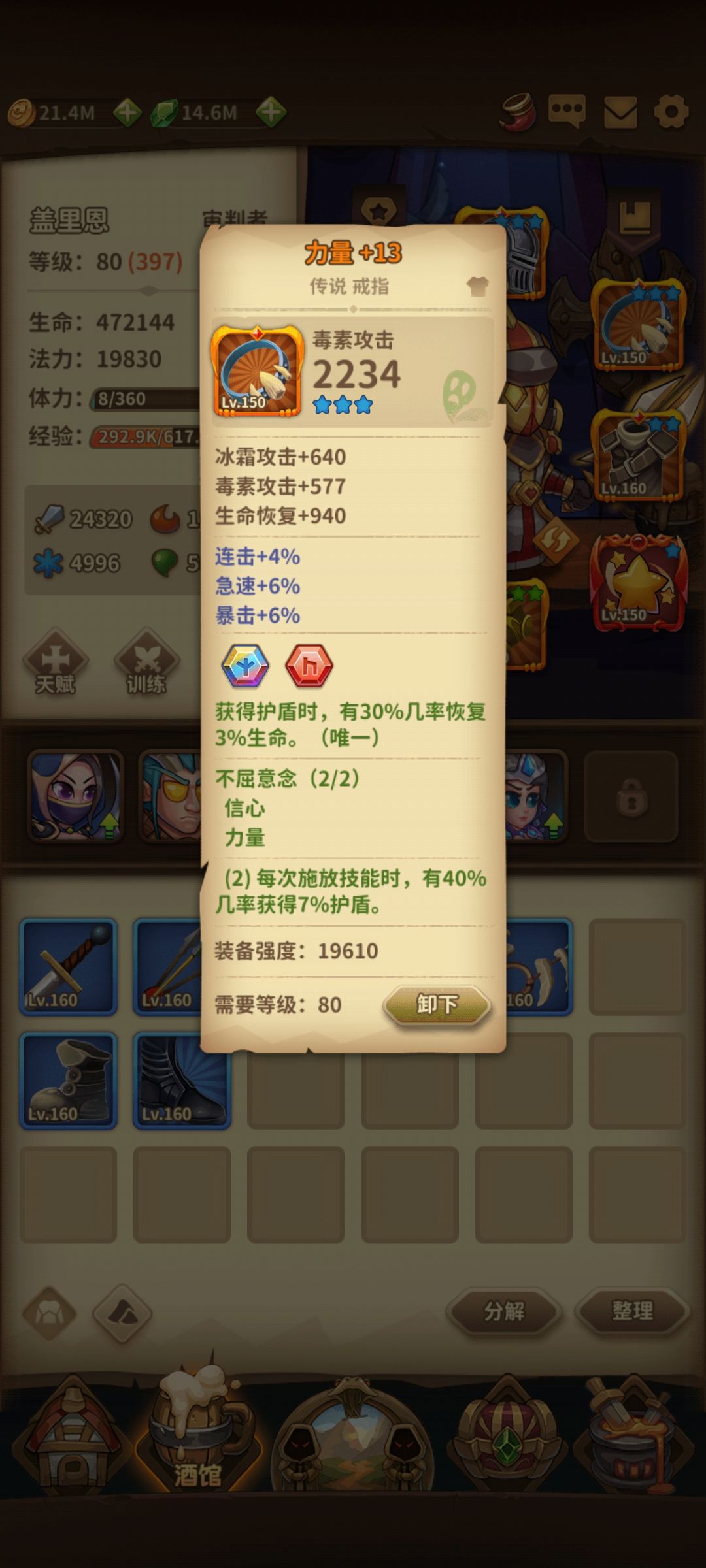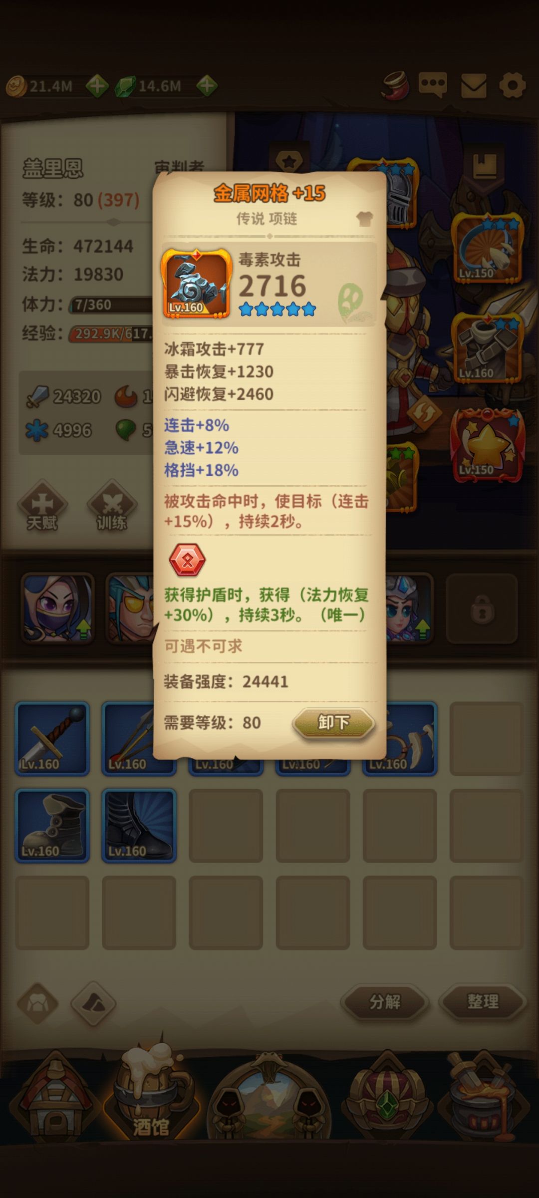 于是疯狂开箱,看到套装属性之后发现用套装可以混合搭配,推塔轻轻松松,100多物抗的怪照样用审判者打,信心力量一套选一个(戒指项链,专精选一个)公正一套选一个(护手戒指,专精选一个加角斗士一套共6件,后两件我用的是金属网格和星之雨,强化最多+15,基本都是+10,不多说直接上图