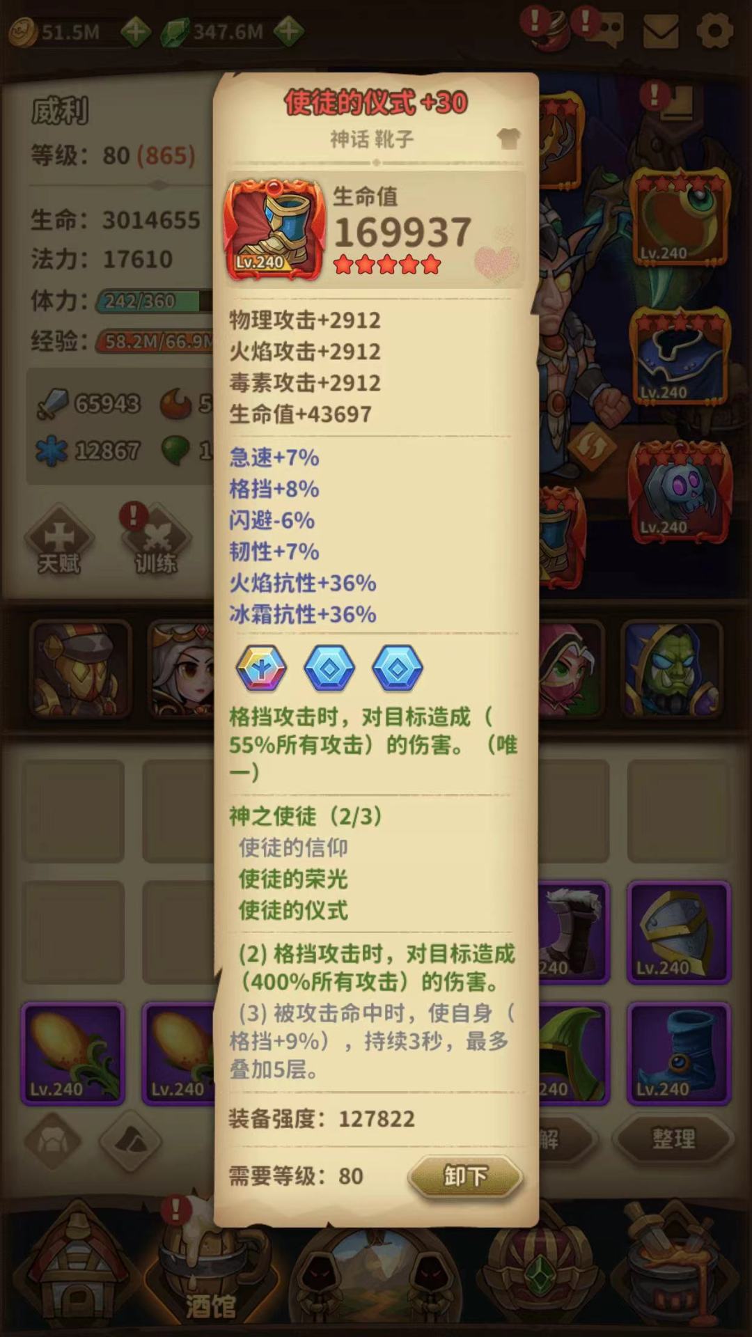 格挡德与其他职业或者玩法比,配装相对固定,首先神话装备雷打不动的厄运+使徒两件套。虽然也可以用厄运+沼行者+(格挡头/金手指/破败甲…),但输出上都不如二攻/三攻下的使徒套。