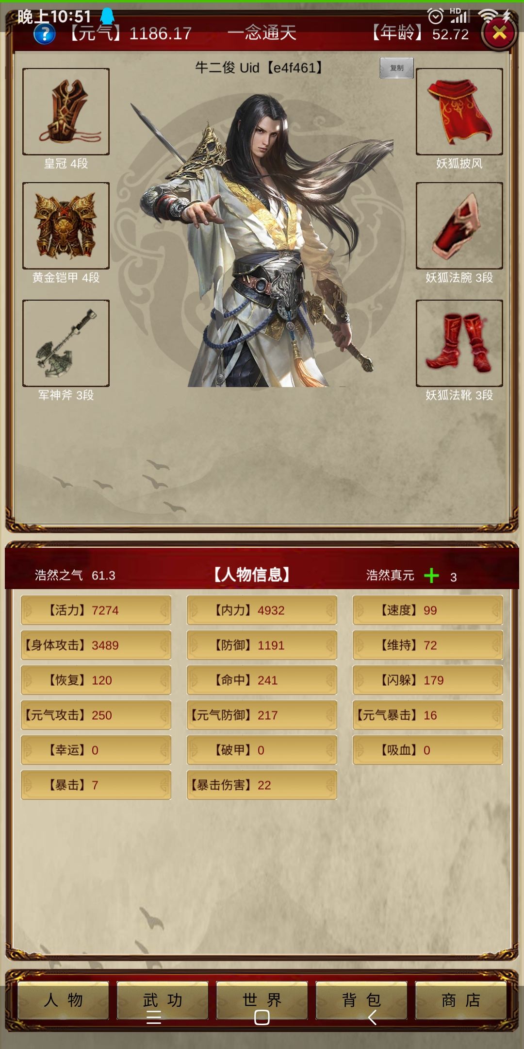 千年塔里有一个重要道具和天赋息息相关,它就是简单塔70层和普通60层的奖励--武功心得。公共天赋需要用到武功心得,千年塔是武功心得有且唯一的出处,所以过70层简单塔得到武功心得奖励是众多老手迫切需要拿到的资源(普通60层暂且不说,现阶段无法达到)。玩家月蓉提供了一个賭运气的思路,一层心法雷电搭配北冥賭闪躲是有一定几率过70层(无非是多试几次,多耗一点大药)提供参考属性如下图