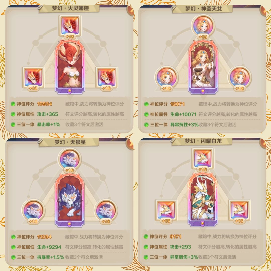 那么问题来了,自身常用主流符文全部梦幻完毕后,还有一些目前版本没有作用的红闪符文还需要梦幻吗?这里我个人建议根据你自身情况来定,如果你有多余的符文资源是可以梦幻的,毕竟有高级百分比属性加成,其次还有神位属性加成,虽然不多但是积少成多,差距就是从积水成海慢慢累积的。对于自身用不上的符文,可以强化15后直接梦幻,洗练不追求属性对错,只追求高评分,高评分转化的属性越高,资源有限的情况下可以只强化15就够了,后期有溢出的资源可以再考虑强化18。