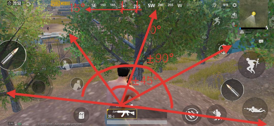 其次就是视野转角±90°,后面讲解直接去掉±号,望理解,一小格大概是15° ,如图。