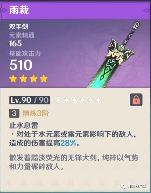 首选雨裁作为武器,不仅提供元素精通,还提高命中水雷附着敌人时的伤害,缺点是纳西妲草元素溢出,效果不一定能完全打出来。