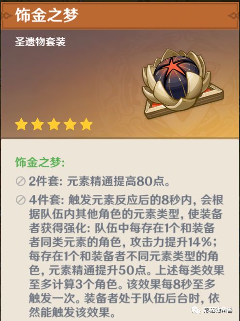 饰金套效果简单粗暴,就是直接加属性面板,而且能够使用的角色特别多,算是反应伤害的万精油圣遗物。