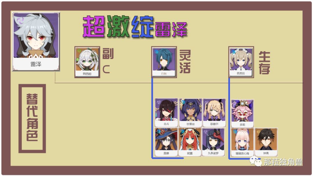 超激绽雷泽队,草神原激化的伤害占总输出很高的份额,单人稳定挂草几乎没有替代。 行秋可以弥补芭芭拉挂水的不足,雨帘剑也可以抗打断并提高生存能力,如果操作比较自信也可以提高行秋输出打伤害。替换北斗可以提高挂雷频率,但是雷系角色会导致挂水不足(其他雷系也是),使反应偏向激化,莫娜和妮露主要是挂水用的,队伍中行秋和妮露最好是用满精的圣显之匙。 生存位的芭芭拉可以替换上位的心海,也可以用万精油钟离减抗和套盾,多莉可以提高队伍的充能,但无论是多莉还是钟离都会导致队伍上水严重不足而走向激化反应,至于久岐忍就没必要了,不然很容易把雷泽优化掉。超激绽雷泽圣遗物选择