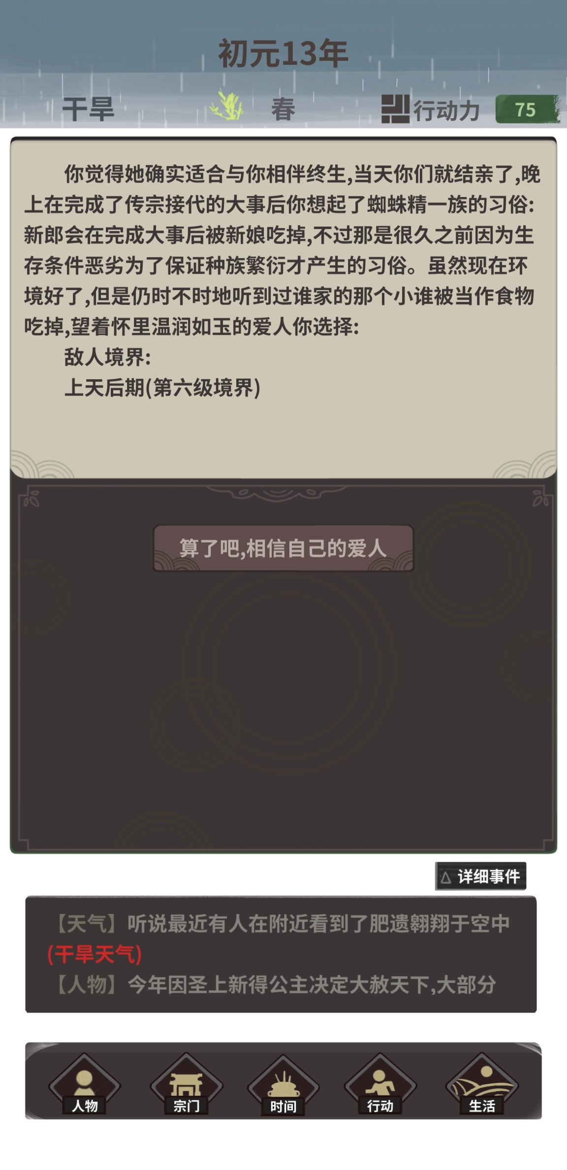 24岁,稳固上天后期,修为已经快要接近圆满了。我决定回家看看,衣锦还乡,毕竟,此时以我的目前实力庇护一方蜘蛛洞还是做得到的。随便取个老婆贴贴,该稍微放松一下,唉,蜘蛛族全是俊男美女,种族天赋好,没办法。然后,事情就尴尬了……当红娘给我介绍对象时,我发现……这五个妹子全都是上天后期,虽然修为略低于我,但也已经达到了世界的巅峰一列……而且,岁数……和我相差不大。我似乎明白了当时为什么那群长辈要用那个眼神看着我了,在家躺平就好了,过几年直接修到最强,不是随便出去逛……在这种强烈的打击下,我疯狂的用人是不能看不见阳光的,看不见阳光会自闭的,而且这方山洞一共也不大,容易抑郁,我这几年的辛苦和担精受怕不算什么……在我安慰好自己,并期待的与妹子洞房时,突然想起来了,蜘蛛交配是不是要吃掉配偶啊……