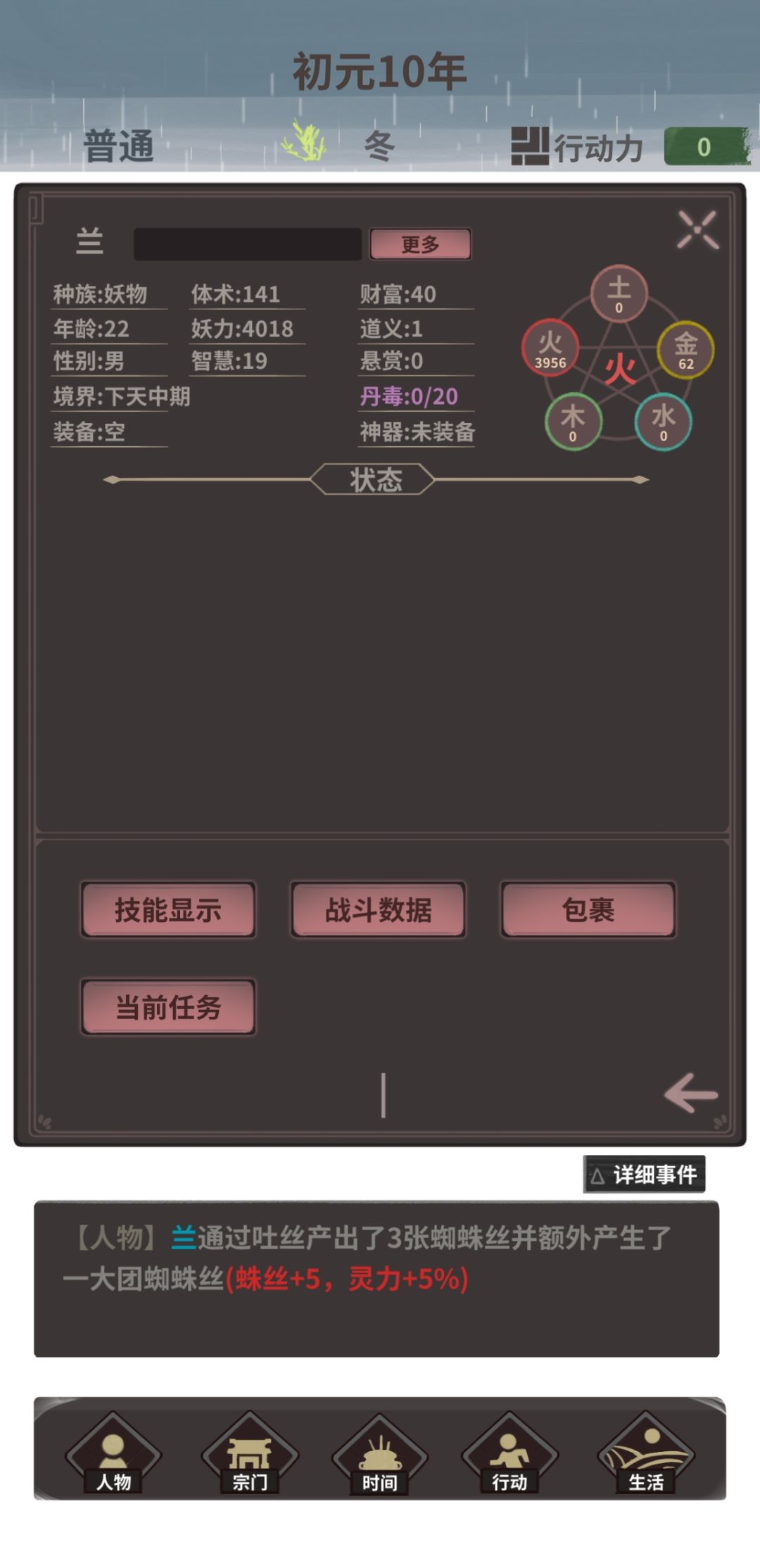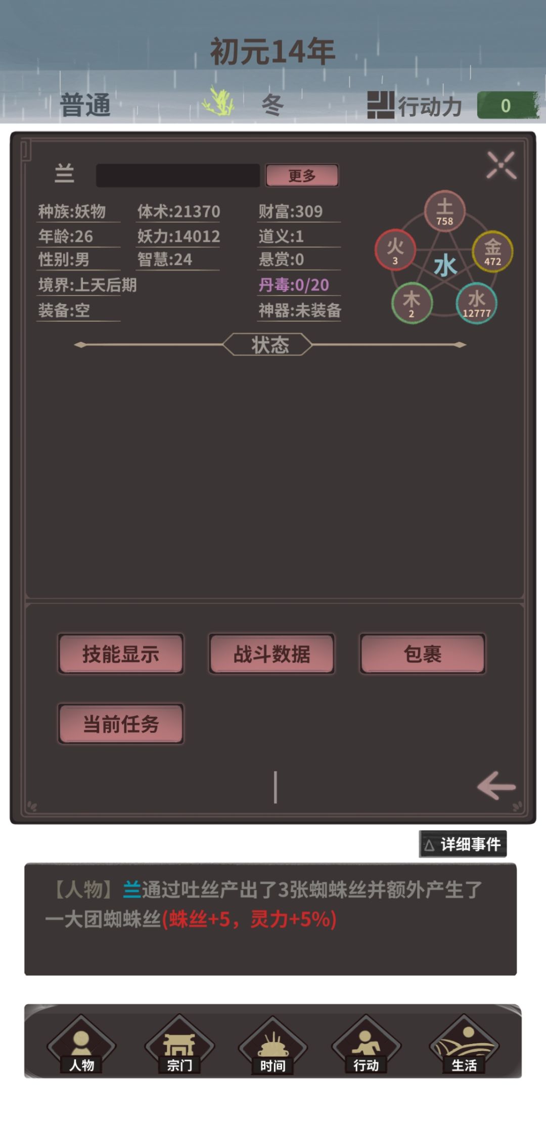 我从洞里带上了一些衣物就跑到了九罗城,我发现我居然可以靠着吐丝就能赚钱唉!好耶!另外还有一点超值得吐槽却又十分合理的是……蜘蛛精的修炼功法居然是以吐丝做为核心!好吧好吧,既能赚钱又能修炼的事谁不爱呢!不过幸亏我机灵,每次都小额出售,山海司的人一次都没抓到过我,我的智商果然是顶级的啊,hahahaha
