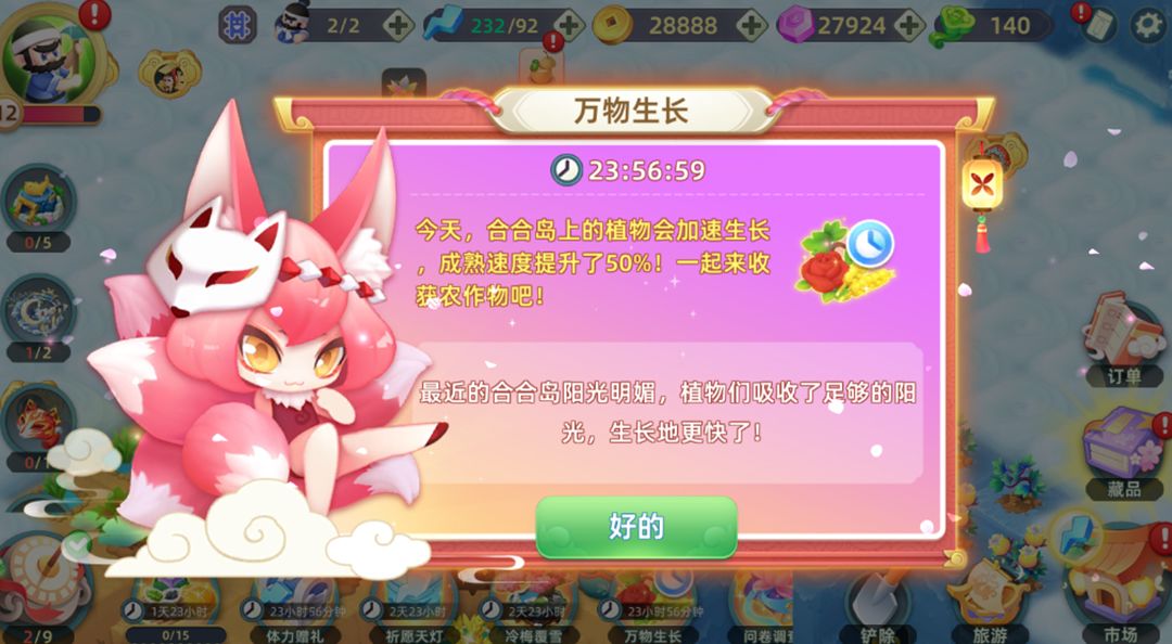 今天合合岛上阳光明媚,所有植物都会加速生长,成熟速度将会提升50%,一起来收取农作物吧!