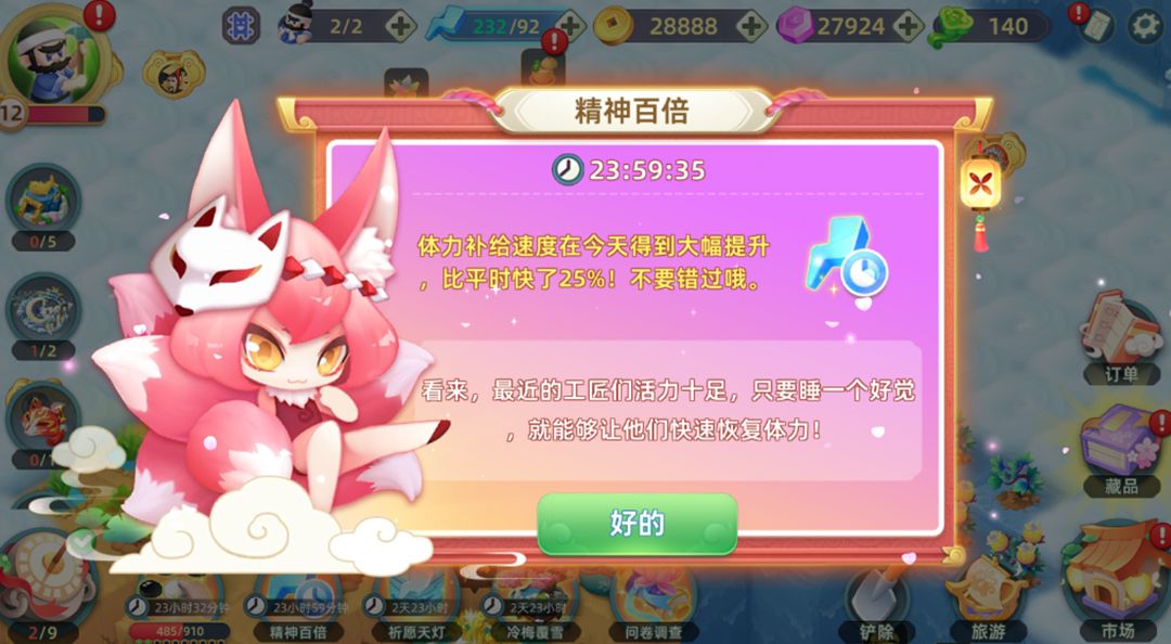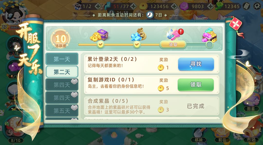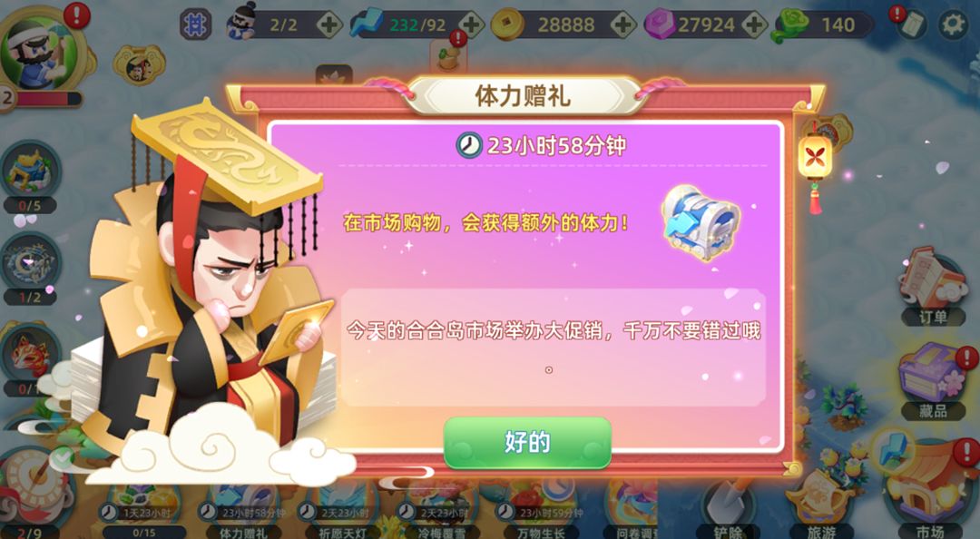 没想到吧,体力活动再续!活动期间,岛主们在市场消耗金币或紫晶购买道具,即可获得额外的体力哦~