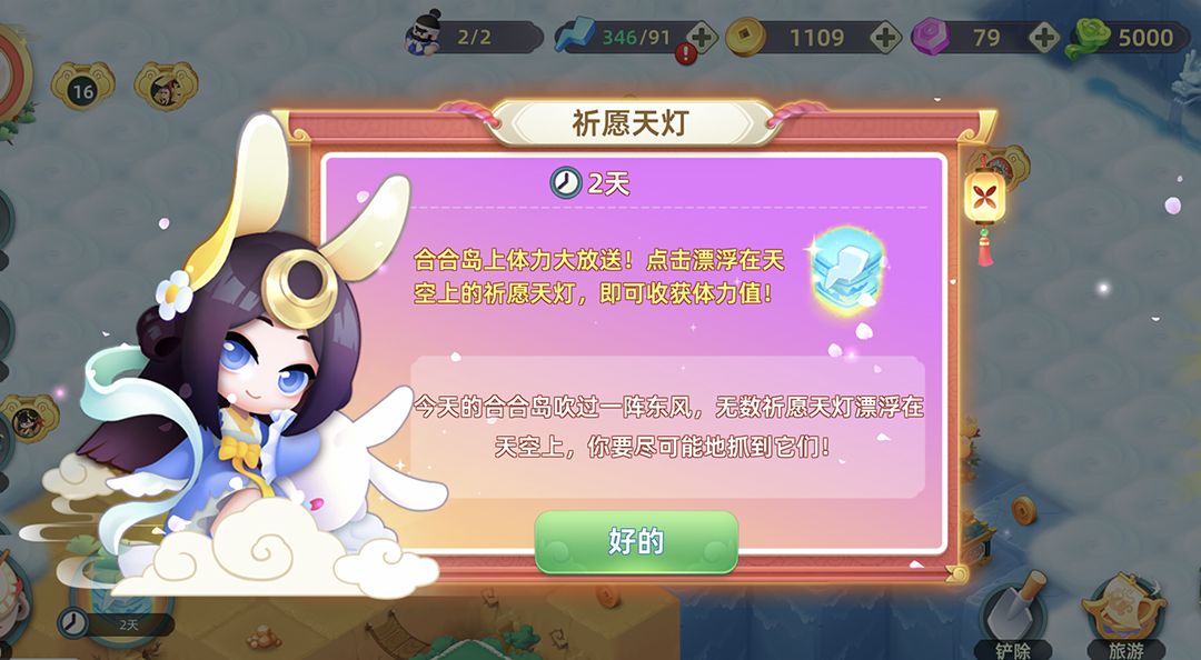你还在为体力不足而烦恼吗,合合岛体力大放送!这次让你玩到爽,点击漂浮在天空上的祈愿天灯,即可收获满满体力哦~