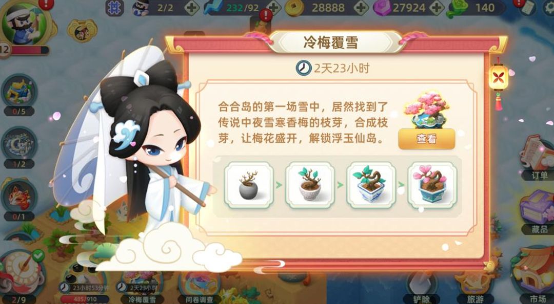 参加活动获得雪梅宝箱,打开宝箱获得夜雪寒香梅的枝芽,合成枝芽,让梅花盛开,收集银杏叶解锁浮玉仙岛吧~