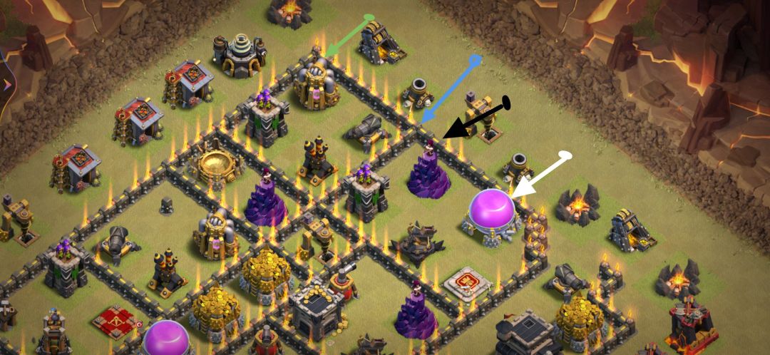蓝色路线,很大机会可以开到两个阵型格子区,但,我们开墙时要小心隐形炸弹,对于这种隐形炸弹反制开墙,我们要做的是,首次开墙不可急,先下一个试探陷阱,再拉住防御建筑开墙。