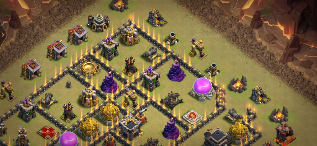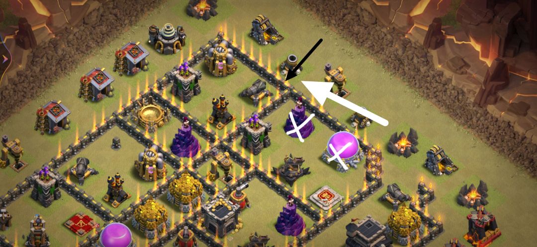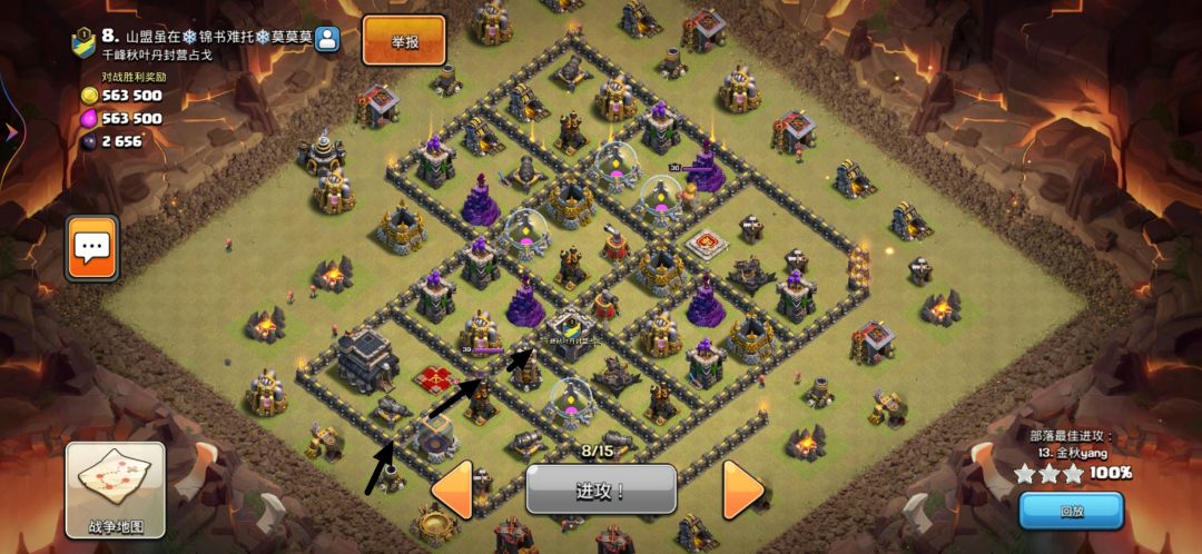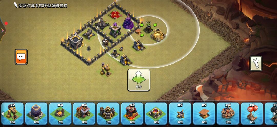 这样,把圣水瓶,和法塔划掉,避免干扰开墙,天女打掉迫击炮后,下炸弹人开墙,打通两个格子,然后圣水采集器的墙已经失效了(只成了一个建筑因为两个格子已经开通了墙)