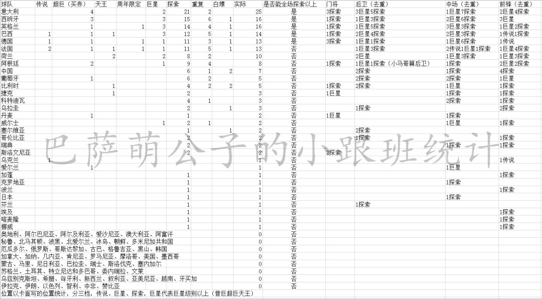 许久没有统计截止本次更新后俱乐部、国家队全部11人探索以上球队统计,增加新的统计维度,更加直观