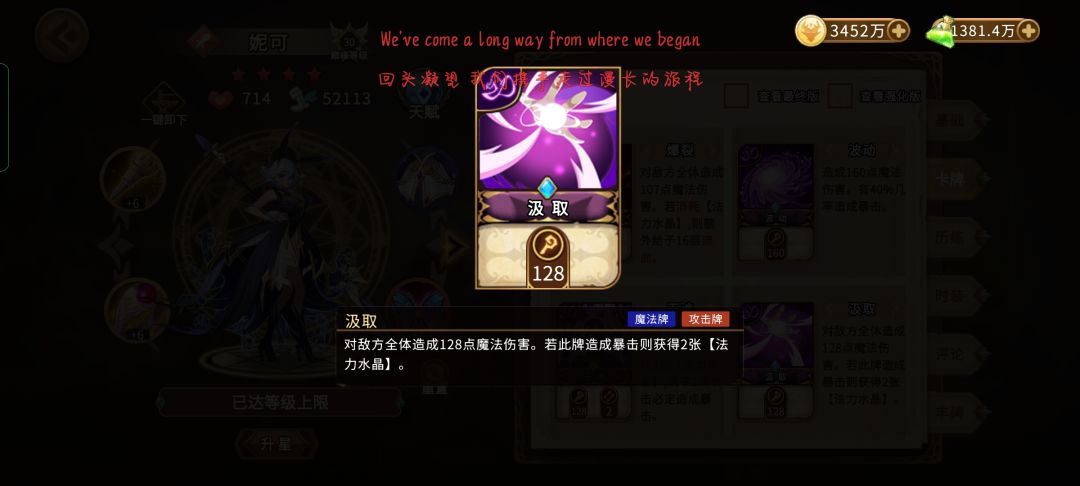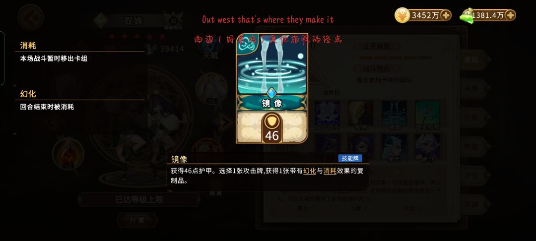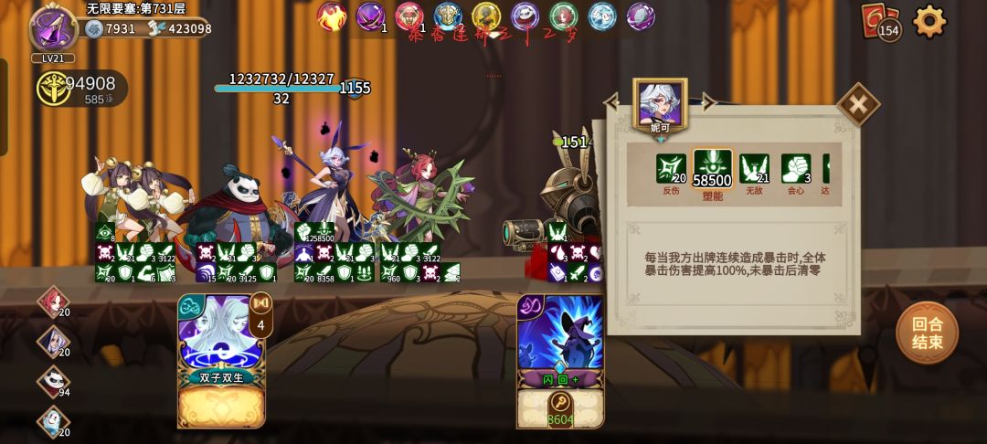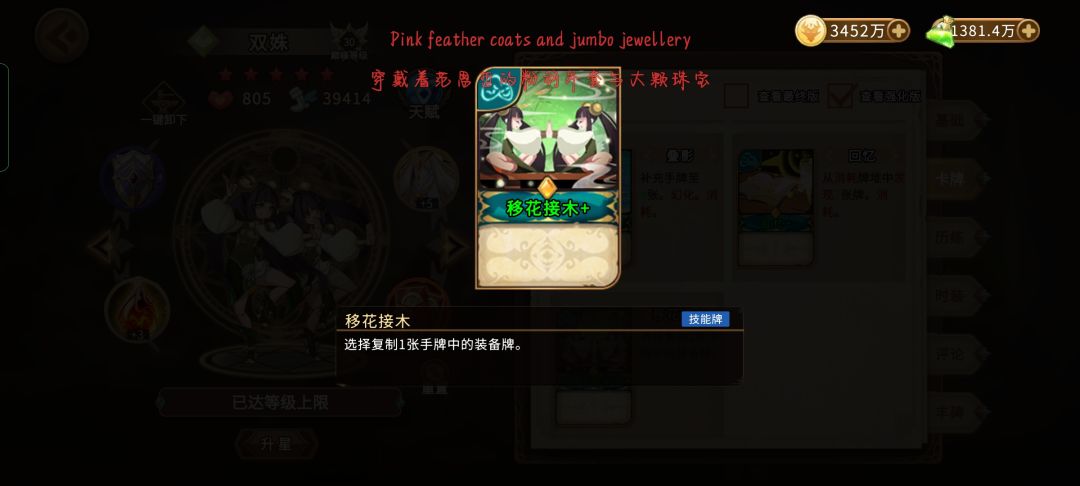 利用大招复制镜像和手牌,别复制过多,防止手牌被爆,没加手牌上限的小伙伴留4张复制,有的话可以复制更多,建议复制的手牌里留至少一张镜像,有大招个人魂的大复制是可以把已经复制的手牌在本次战斗中暂时存入你的牌库,更容易去实现一轮大过牌。皮肤卡移花接木是可以在战斗中复制无敌甲让本没有10个无敌甲的小伙伴能打出10张甚至更多,但有11张无敌甲以上的小伙伴记得把移花接木移除牌库,不然大招复制到移花接木会影响你后面过牌,无敌甲终归也就只需要11张及其以上即可,太多用处不大。利用回忆找北风的冲撞来继续过牌,双妮阵容最大的缺点就是有点费手,剩下还好说,之前有幸一回合过牌单攻击牌就达到了585张,利用无敌小怪刷一下妮可的暴击倍率来防止后面遇到小怪会暴毙![[嗒啦啦4_破防]](https://img.tapimg.com/market/images/e7a8b374540ede92a57ce1f447a9ec65.gif)