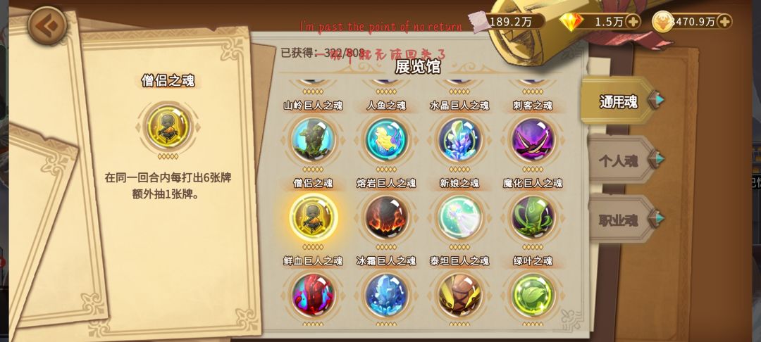 在要塞中的魂,你想卷第一肯定是要做到5级国王魂,10级太晚咯,先让个人魂占满你的魂槽,假如10级的时候给的两个通用魂有用的也可以带上,因为魂槽点满的话是可以空出几个位置给你的通用魂的,等个人魂满的时候去反复替换熊猫的个人魂来提高自己的血量上限,在要塞中遇到增加血量的事件一定要选,那个降低速度增加血量的事件挺好的,加的也是百分比,速度在要塞中的性价比只是懒狗们一路碾压的工具罢了,但不能没有,不然会让你更快逆速,所以羽毛和血瓶切记要买满