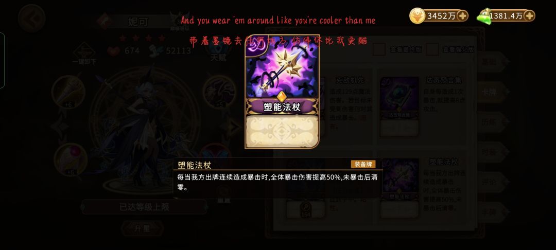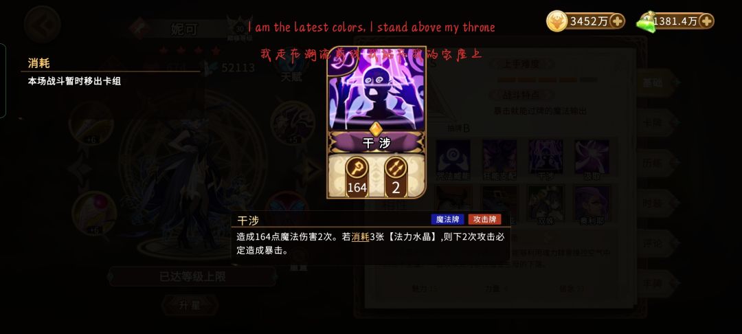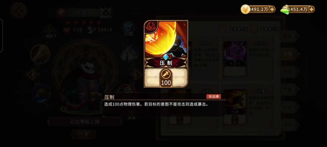 双妮阵容北风可以选择不带压制,因为石中剑是全队本回合必定暴击,压制换成过牌冲撞,破胆怒吼必带,给固有