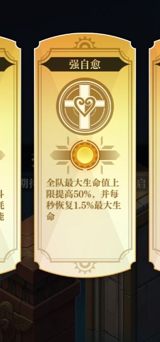 最最最首推就是这个“强自愈”,回血回的很猛,再配上另一个效果名为“医疗箱”buff(感谢评论大佬补充),效果是队员每次被治疗时释放一个盾牌,一秒5个盾,扛怪基本一点血都不掉,掉了立即就回上。活着才有输出,这个buff谁用谁知道。