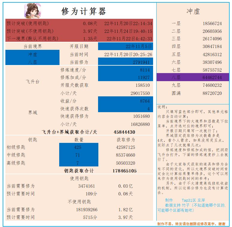 分享一个计算修为的小工具,只需要填写蓝色单元格的数字就可以了哦,小伙伴们可以作为境界突破的参考;