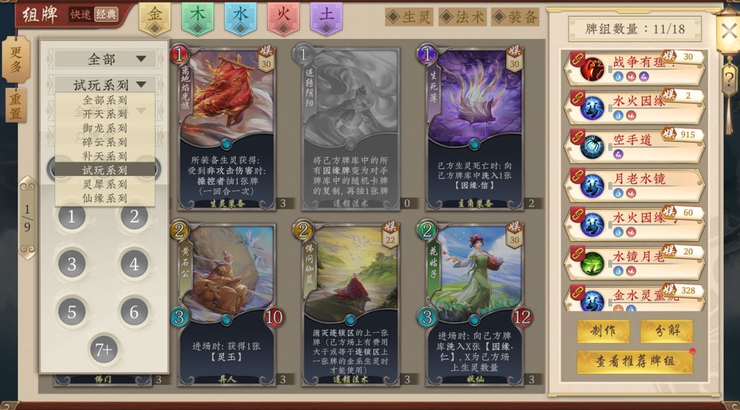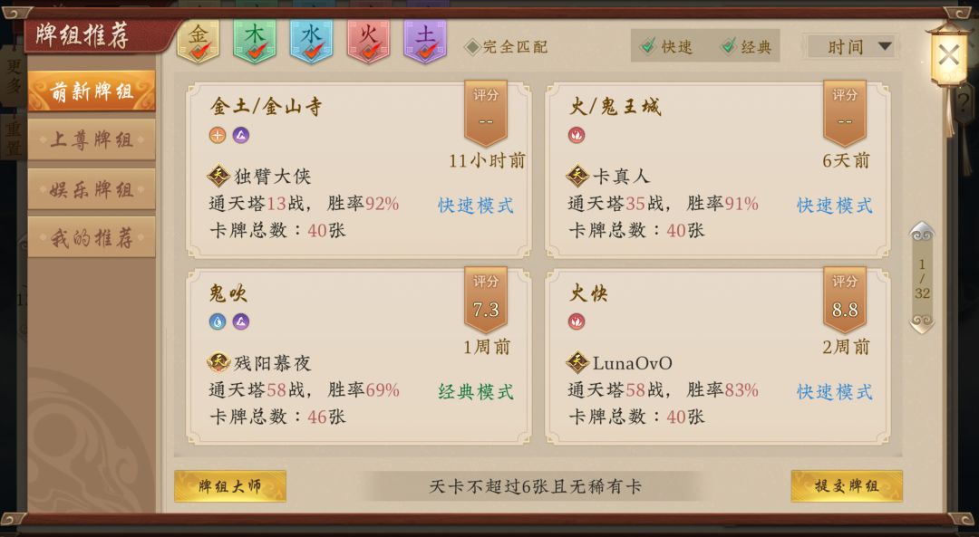 许多试玩卡物美价廉,很适合萌新上手,毕竟1灵石合了也不亏。但是加了这些卡的卡组无法上传至推荐,这就导致推荐牌组里的卡组都没有试玩卡,环境相对滞后。再加上上传卡组本身也没有什么福利,基本算是用爱发电,久而久之这里面卡组的素质也就参差不齐了。