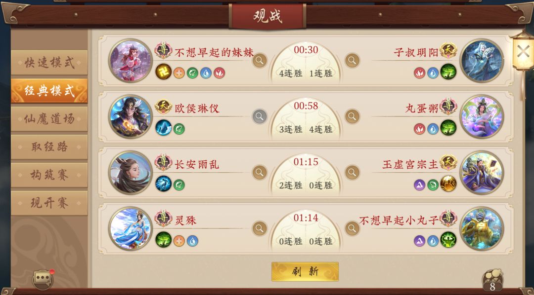 最后是游戏内本身自带的观战系统,可以去里面看大佬打牌,学习他们的修炼、出牌思路、卡组。但是要注意,观棋不语真君子,爆牌可就不太行了。