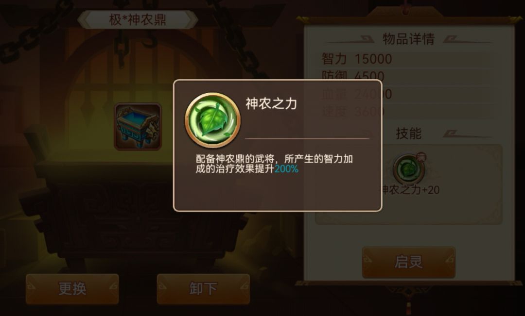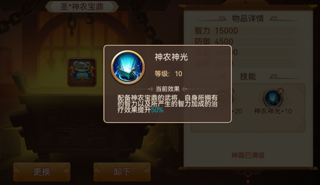 作用效果:神农鼎是提升回血量非常重要的辅助神器,特别是配合卞姬这类回血将,基本上技能可以直接回满血,即使使用全体回血策略,也可以回复大量血量。