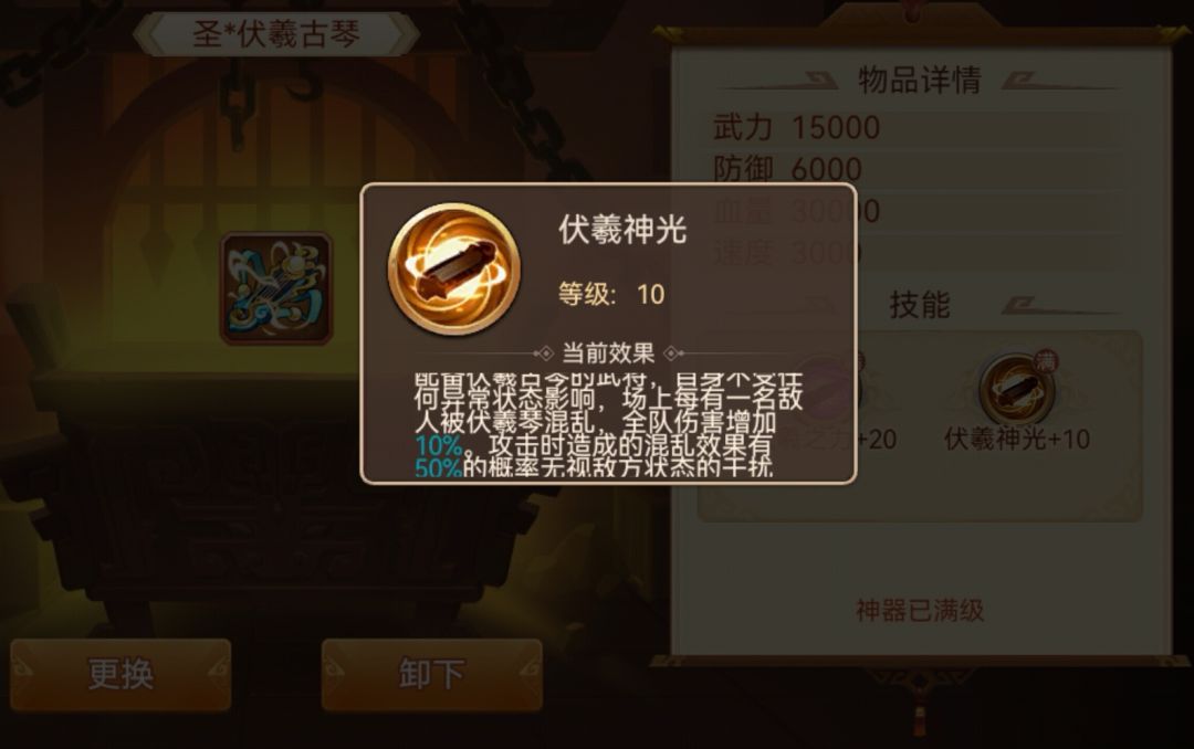 启灵后:自身免疫异常效果,使用伏羲琴每混乱一个敌人,全队增伤4%,且有20%概率无视对方免疫效果造成混乱。增伤效果每级+0.6%,混乱效果每级+3%概率,圣神器增伤效果10%,混乱效果50%概率。