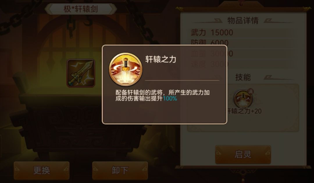 作用效果:轩辕剑无论启灵前还是启灵后目前都是平民第一武力输出神器,也是首选启灵的对象,配合目前主流武力输出童渊,因为童渊被动增加武力多,且有50%无视效果,能很好的匹配其效果。