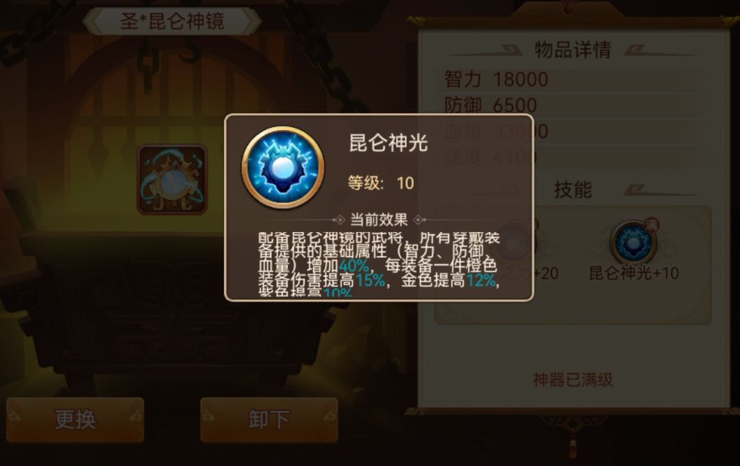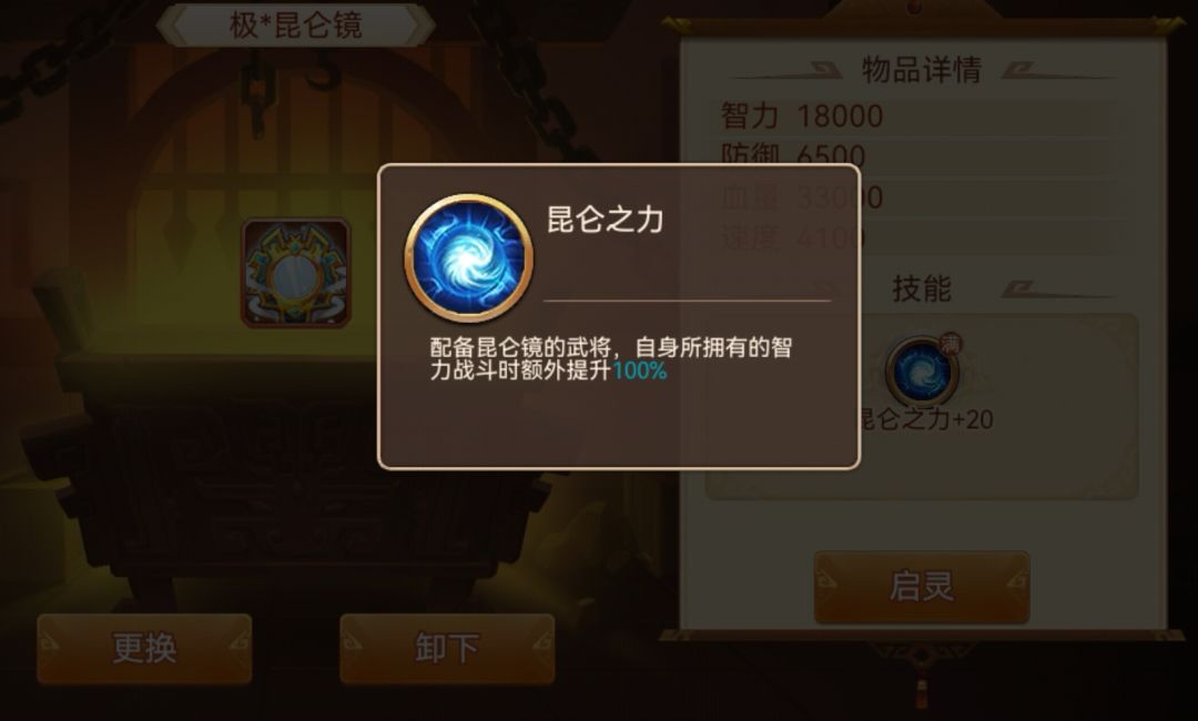 作用效果:和东皇相似,不同的只是东皇加武力,昆仑加智力,包括启灵后的机制也相同,这里就不再赘述了。但因为智力将整体不如武力将好用,所以性价比不如东皇,目前最大的作用应该是大佬们拿它启灵加面板,来堆战力装逼吧。