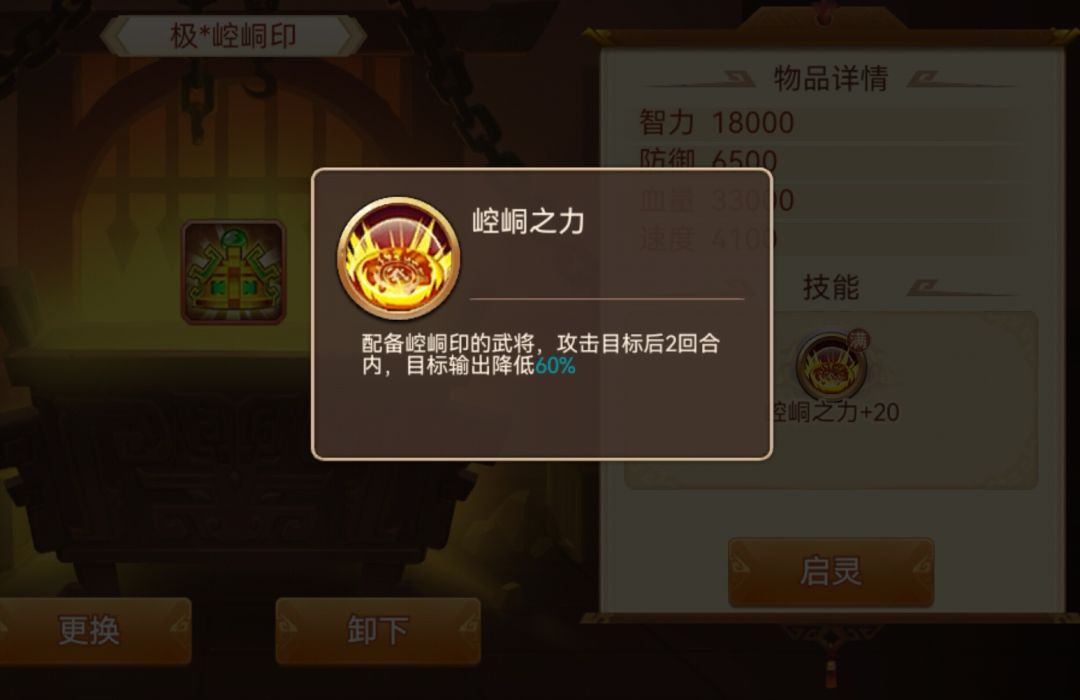 作用效果:启灵前,60%无视防御对本身没有无视效果的武将还是很好用的,加上本体的30%暴击和60%爆伤,且武智均可使用,是非常不错的通用型神器,但它更偏向于打高防怪,对低防怪的效果就有些一般了。