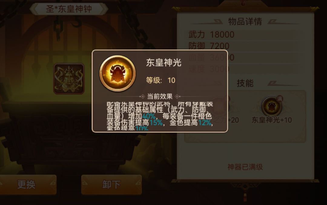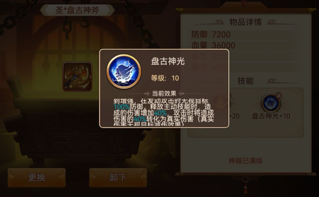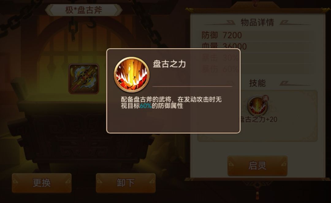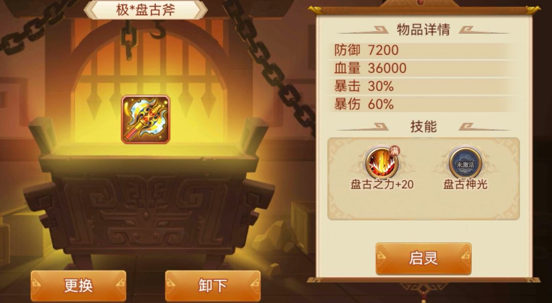 启灵后:武力武将使用时,增伤和增加武力各20%,每级各+3%,圣神器增伤和增加武力各50%(注:启灵后效果和启灵前效果均同时生效,其他神器不再赘述,唯一特殊的是盘古斧,后文会描述)