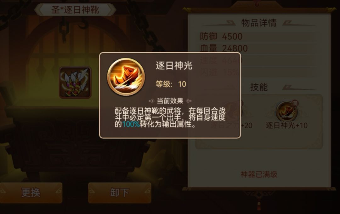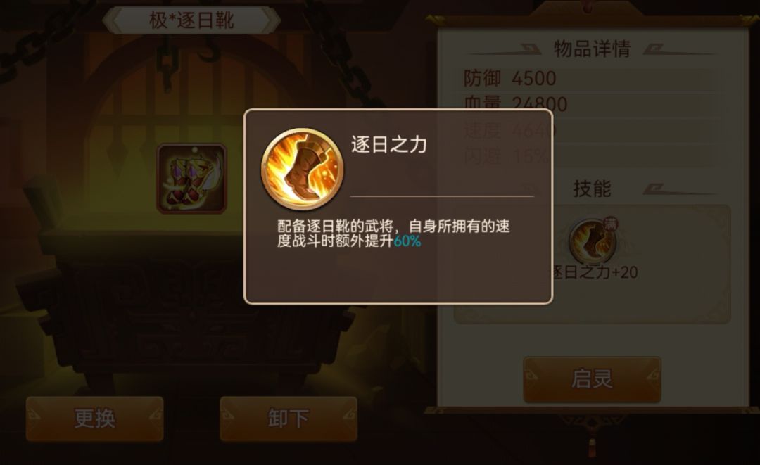 启灵后:强制一速先手(启灵后就有效),将自身速度40%转化成武力或者智力。每级转化效果+6%,圣神器100%的速度转化成武力或者智力