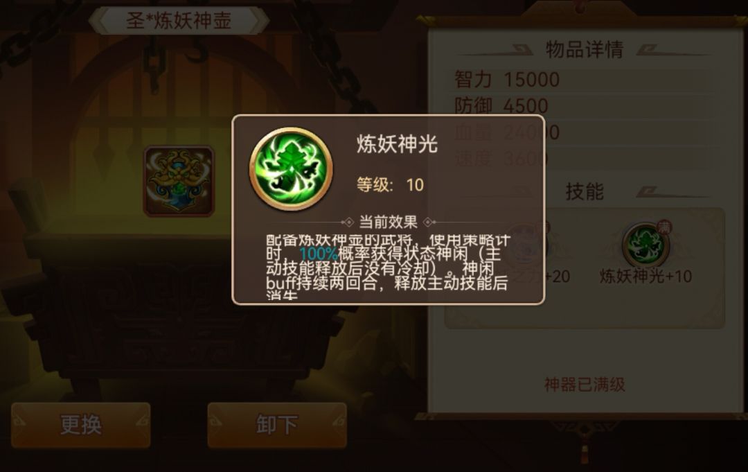 启灵后:使用策略时20%概率获得神闲BUFF两回合,神闲状态下可以连续两回合放大。获得神闲概率每级+8%,圣神器神闲概率100%