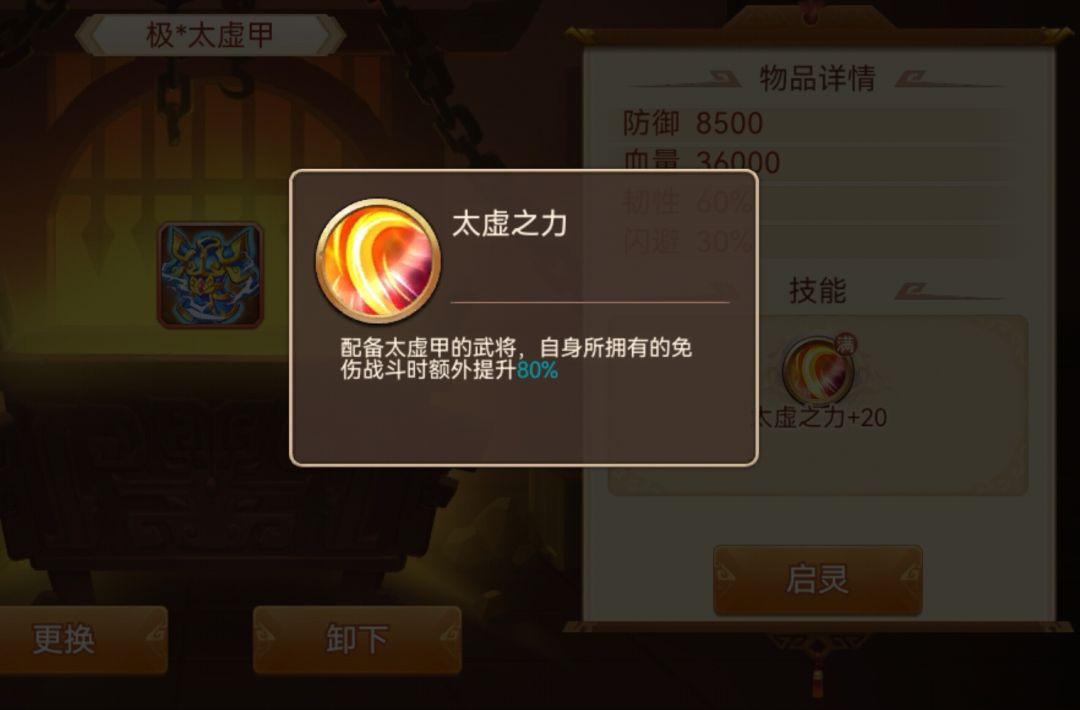 启灵后:受到攻击时20%概率触发太虚效果,不受任何伤害,同时,触发太虚时,全体增伤10%持续四回合,最多叠加四次,且不会被清除。每级太虚触发概率+6%,增伤+1.5%,圣神器太虚触发概率80%,增伤25%