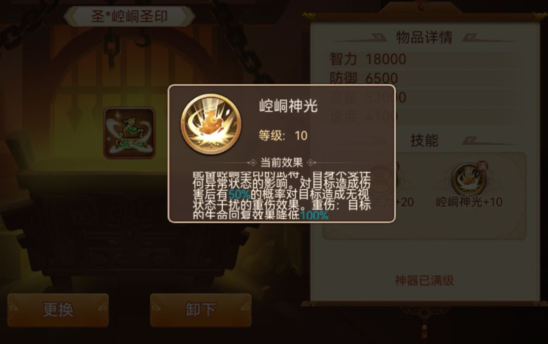 启灵后:自身免疫异常效果,20%概率无视对方免疫效果造成重伤两回合,重伤效果降低对面回血40%。每级重伤概率+3%,降低回血+6%,圣神器重伤概率50%,降低回血100%(相当于禁疗,回血0)
