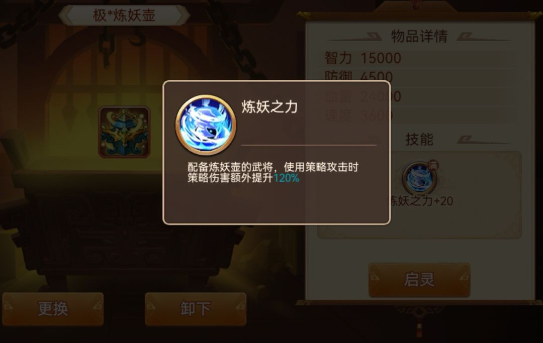 作用效果:启灵前炼妖效果一般,毕竟策略伤害不是主要伤害手段,其主要作用是平民缺少神器时,给副输出使用,增加非技能回合的策略伤害(包括弩炮也有效)。