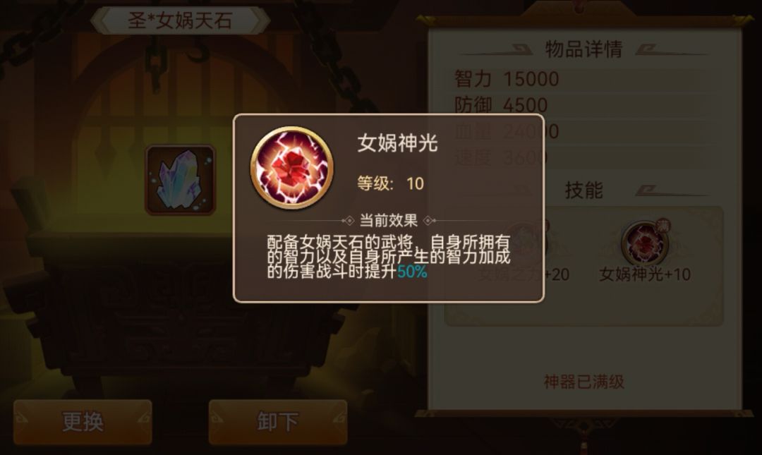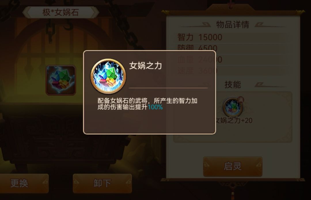 启灵后:智力武将使用时,增伤和增加智力各20%,每级各+3%,圣神器增伤和增加智力各50%