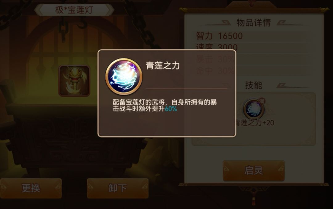 启灵前:智力武将使用时,增伤40%,每级+3%,极神器增伤100%