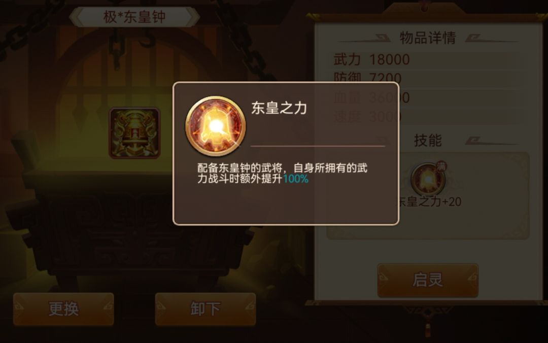 启灵前:武力武将使用时,增伤40%,每级+3%,极神器增伤100%