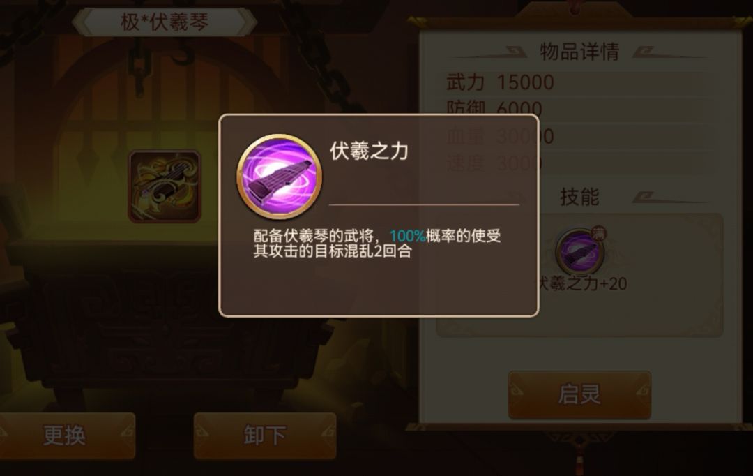 作用效果:效果非常强大的神器,启灵前混乱的概率就很高,而且混乱效果会被多段攻击多次触发,比如貂蝉三段攻击可以触发三次,即使只有进阶+10,70%概率在多段攻击下,基本只要对面不免疫,大概率被混乱,而因为被混乱的敌人只会随机普攻我方,所以威胁会大幅降低。但随着后期免疫怪越来越多,未启灵的伏羲效果直线下降,而这个弱点,在启灵后被弥补。