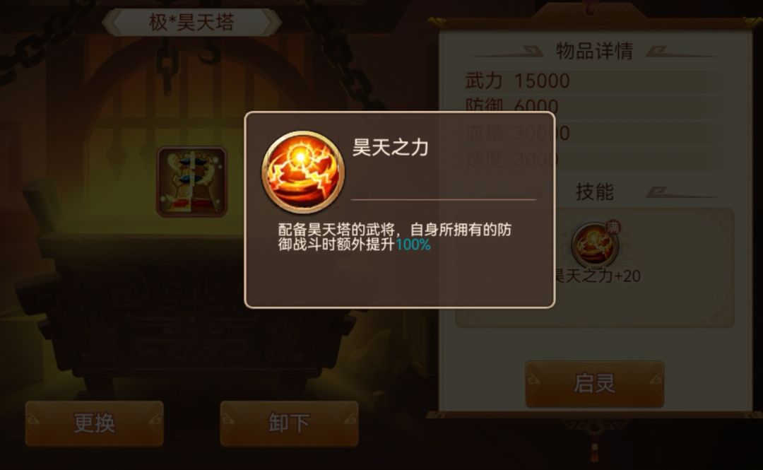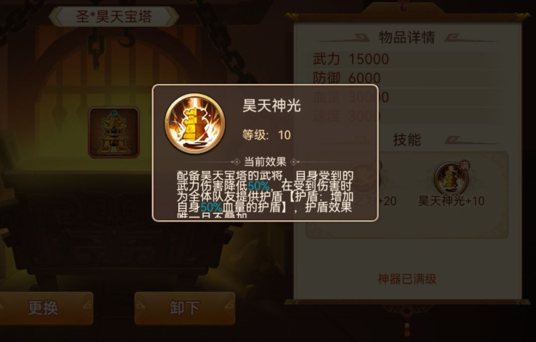 当然有一点要提醒一下,由于全体被攻击时,有一个判定优先级,所以携带昊天塔的武将,建议放在武将界面最上的位置,因为受到全体攻击时,这个位置是第一判定,也就会第一受伤并触发护盾效果。