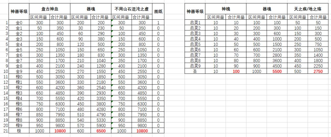 进阶到极神器一共需要:6500神器之魂+10800盘古神血+10800不周山石或混沌之虚(含制作材料)