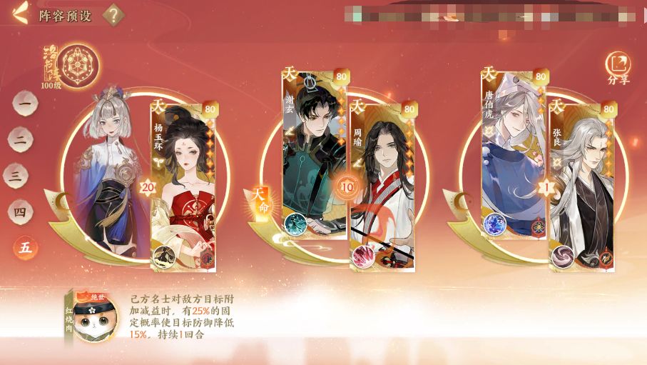 这套阵容即使没有防御名士,坦度也是十分恐怖,基本不用担心前三回合减员的情况。但是河图阵的加攻以及回合增伤也是不可小觑的,在对局中,我们依旧要速战速决,不可久拖。内战上陆游,打控制队上祖冲之,打多C或者群攻上玉环,几个治疗之间可以轮换。